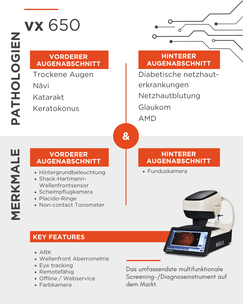 Dank Shack-Hartmann-Wellenfronttechnologie in Kombination mit topografischen Placido-Ringen und einer externen Farbkamera bietet das VX 650 Werkzeuge zur Diagnose, Beurteilung und Überwachung eines Keratokonus oder sonstiger Hornhautpathologien wie etwa Augentrockenheit.