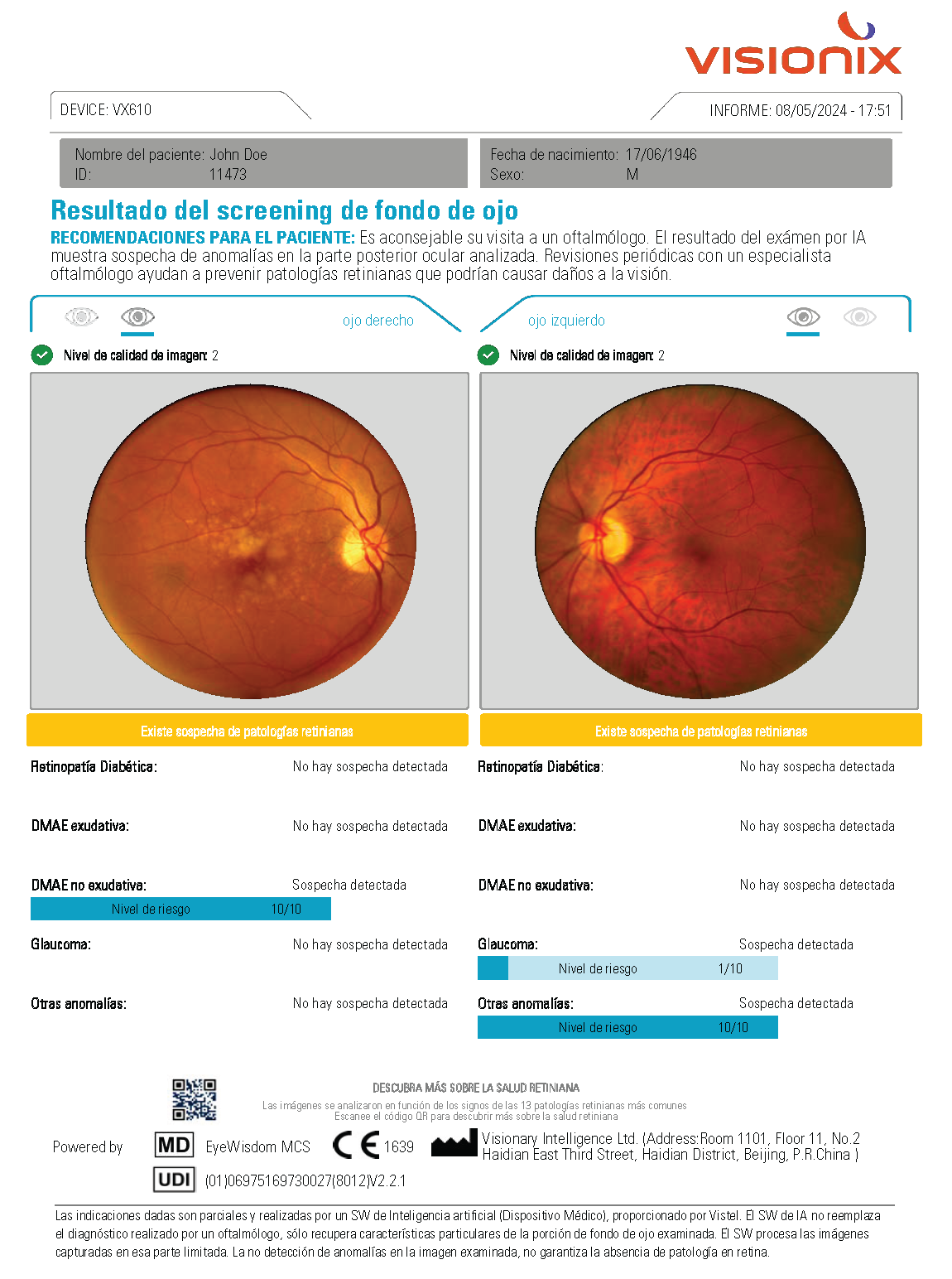 En la práctica, los datos y las imágenes del paciente se recogen con la tablet proporcionada junto con el retinógrafo VX610, en la que se valora la calidad de la imagen y se envía para su evaluación por la IA, que proporciona los resultados en un minuto, presentados en un informe PDF imprimible en el que se destacan las posibles patologías de la retina. Si la IA destaca algún riesgo, puede solicitar rápidamente un informe oftalmológico.